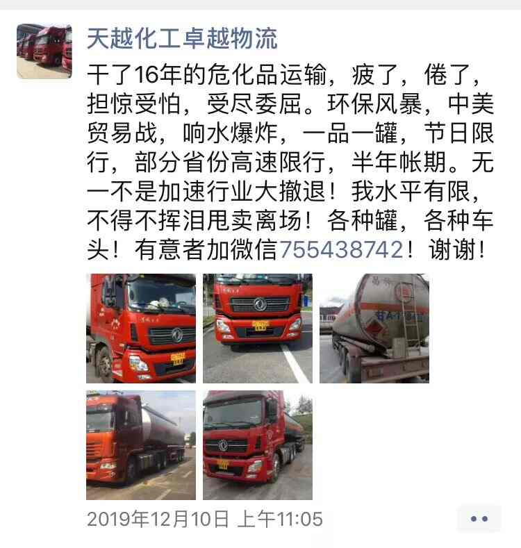 2019年12月10日,罗兴兵在朋友圈发了一条信息:“干了16年的危化品运输,疲了,倦了……不得不挥泪甩卖离场……”