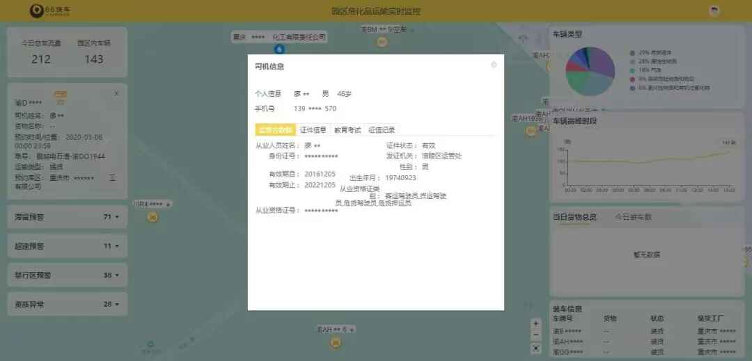 在线备案管理:对进入园区范围内的危险品车辆,系统直接获取车辆在运管部门的备案证件信息,自动推送资质异常的危险品车辆预警消息,园区可据此及时发现处理,并可通过系统进行黑名单管理,限制资质异常的车辆进入园区作业。