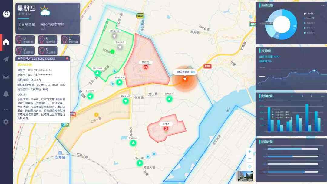 电子货单管理:方便监管部门实时查看装卸货物、危险品车辆、人员等信息,实现对人、车、物精准管理。应急风险提示及辅助决策:驾押人员可对园区内车辆事故一键上报,系统可对园区道路进行风险提示和应急管控。