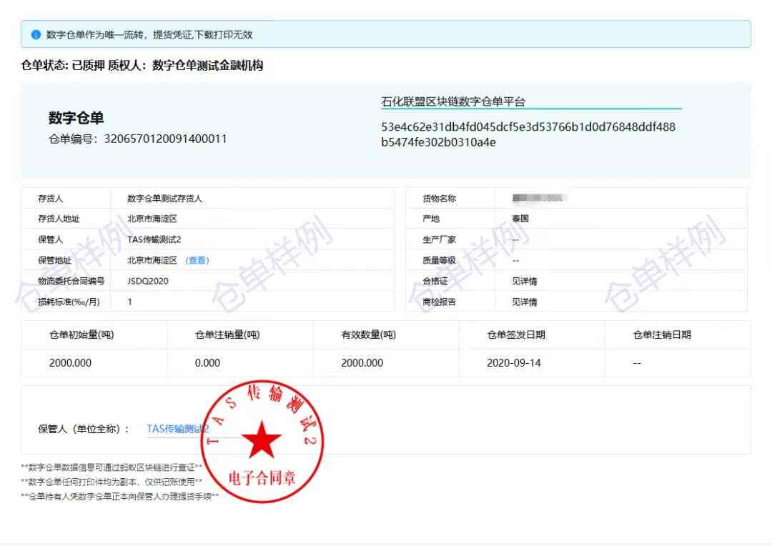 “区块链数字仓单平台”实现数字仓单与仓储货物严格对应,并利用物联网技术对数字仓单下货物进行严密监控,有仓单即有货;解决货物交付难题,实现秒交付、秒质押, 解决了四流合一难题;通过区块链技术进行存证,数据不可篡改,保证数据唯一性,可溯源;所有操作通过电子签章确认,实现法人与仓单对应,避免虚假仓单;对于仓单出质,实时在人民银行征信中心“中登网”登记,实现权属变化与仓单对应。2020年9月27日,北京龙润凯达石化产品有限公司基于库存的基础油,通过中化能源科技“区块链数字仓单平台”,向南储仓储集团申请开立仓单。数字仓单开立后,龙润凯达在线上向建设银行提交了质押申请,并于当天下午收到贷款。从仓储企业签发数字仓单到质押、放款,中化能源科技以可信技术提供商的身份参与其中,并得到了建设银行的高度认可。