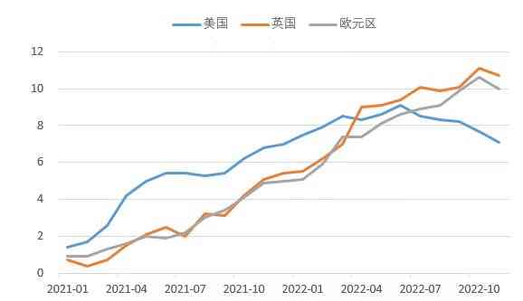 图1 2021年1月至2022年11月美、英和欧元区的CPI同比涨幅(%)