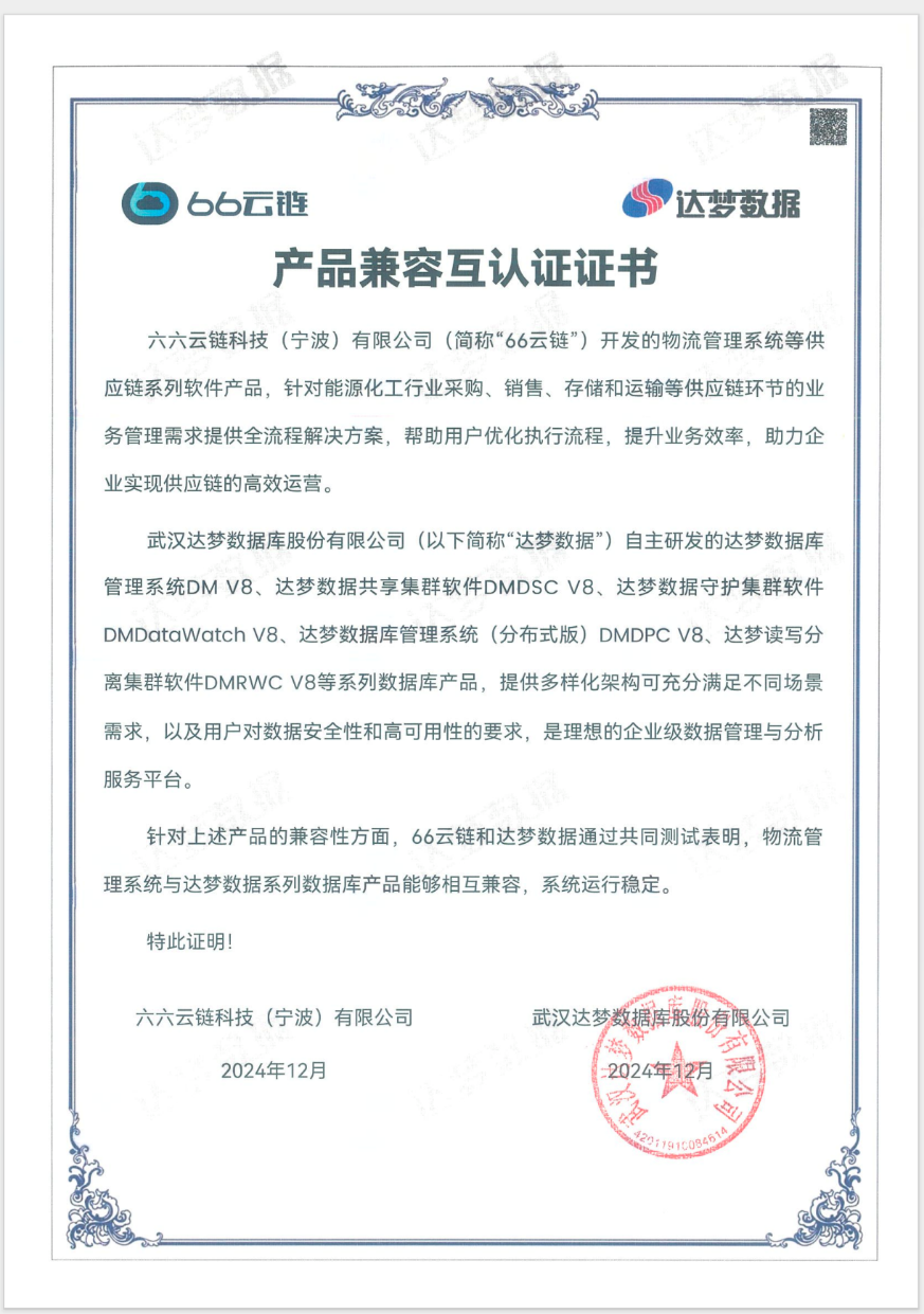 近日,66云链自主研发的“物流管理系统”等供应链系列产品,顺利完成与武汉达梦数据库股份有限公司自主研发的“达梦数据库管理系统”全系产品的功能和兼容性互认测试。