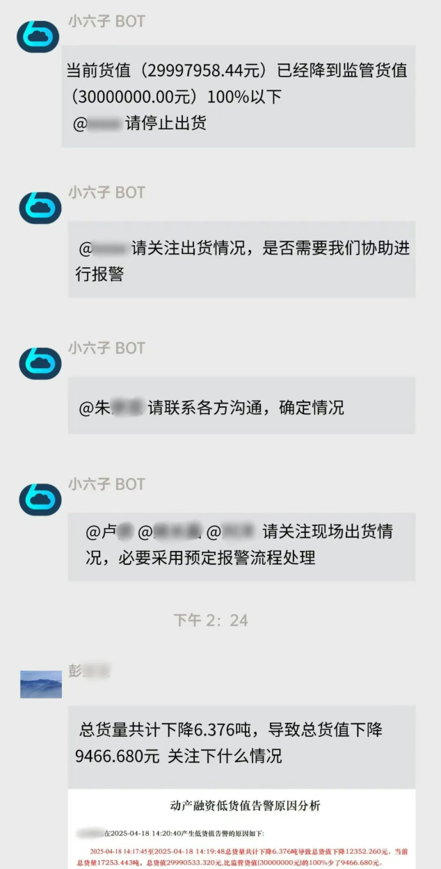 - 7*24小时AI值守,异常情况实时同步:如有异常,「小六子」分钟级预警,按合同规则自动 @ 相关方履约,问题当班闭环;