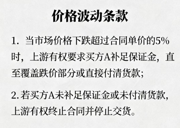 货装船以后,价格真的跌穿了 5%。上游按合同催补保证金、催付货款,但买方 A 两样都没做到。