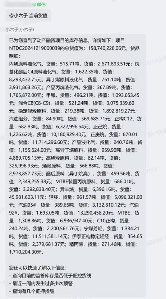 以一个抵押物有五六十个储罐、几十种货品的项目为例,以往银行要看一份完整资产视图,要翻好几份报表、问库方、自己再算一遍。现在,银行风控人员直接在群里问一句:“货还在不在?现在大概多少货值?”,“小六子”几秒钟就给一份结果。