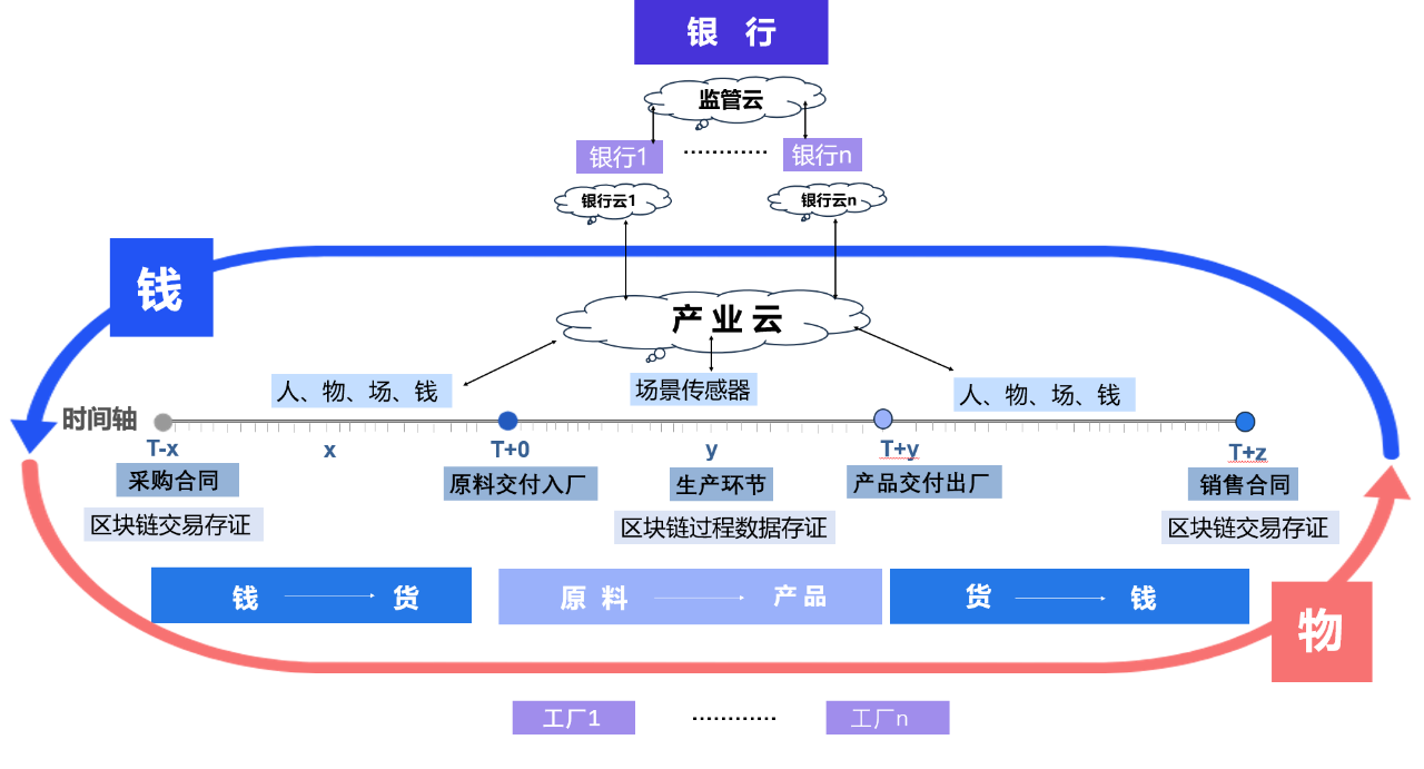 这是66云链参与的国家“十四五”重点课题穿透式监管方法,通过将储罐和物流数据与“钱→原料→产品→钱”在时间轴上进行交叉校验,基于信用模型分析实时向银行反馈工厂经营状况,进而匹配合理的资金需求,并对异常变化实时预警,协助银行构建反欺诈模型。相关技术已通过科技部中期验收。