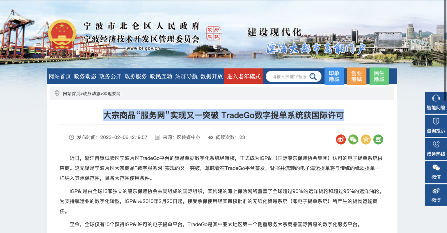 宁波市北仑区人民政府官网|大宗商品“服务网”实现又一突破 TradeGo数字提单系统获国际许可